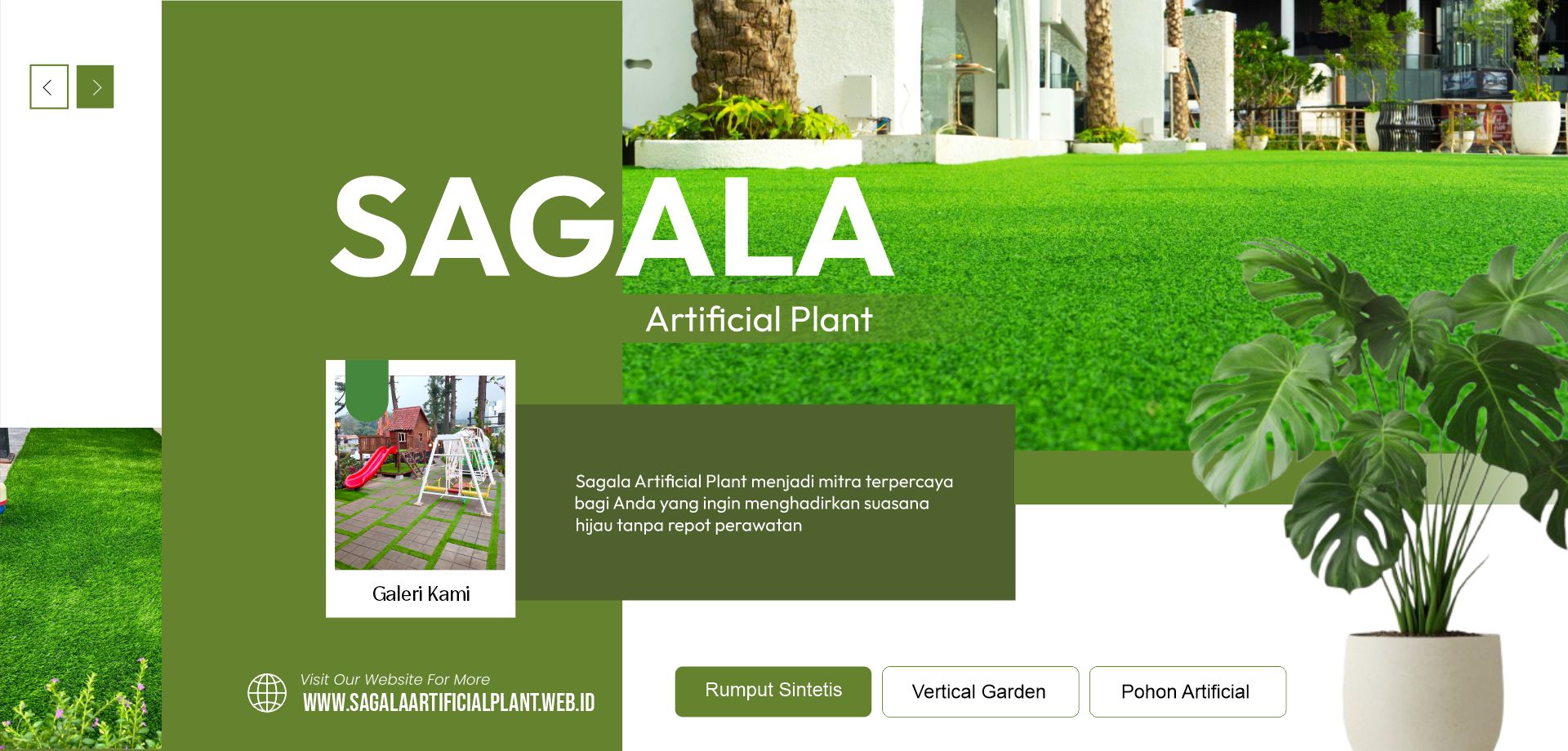 Sagala Artificial Plant adalah penyedia dan aplikator profesional yang fokus pada pemasangan rumput sintetis, vertical garden, tanaman rambat, dan pohon artificial untuk berbagai kebutuhan dekorasi. Kami hadir untuk memberikan solusi estetis, modern, dan praktis bagi hunian, ruang komersial, perkantoran, hingga area publik di wilayah Jabodetabek.